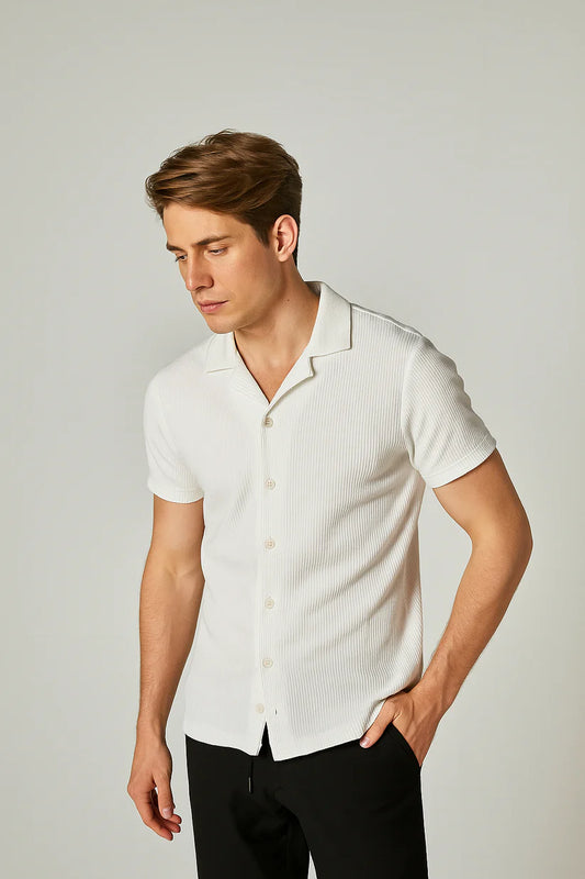 STYLOPHY - Cuban Collar Waffle Knitted Shirt - White